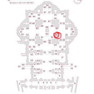 Planimetria delle opere della Basilica di San Pietro in Vaticano. Mappa completa su pianta delle statue, degli altari e dei monumenti dedicati ai santi ed ai papi della chiesa vaticana.