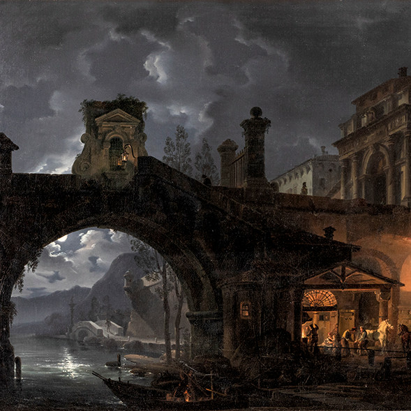 Esterno di città con ponte illuminato da chiaro di luna ed officina da maniscalco, 1829